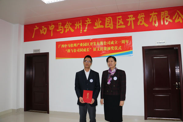 2015年1月6日,廣西中馬欽州產(chǎn)業(yè)園區(qū)開發(fā)有限公司舉行公司成立一周年慶祝活動(dòng),并進(jìn)行了為慶祝公司成立一周年而組織的“我與公司同成長(zhǎng)”征文比賽頒獎(jiǎng)儀式。