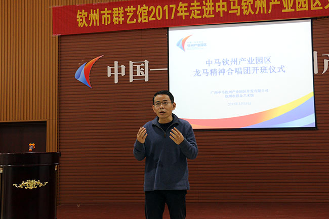 2017年3月15日晚,由廣西中馬欽州產業(yè)園區(qū)開發(fā)有限公司和園區(qū)管委會、投服公司、金谷公司共同組建的中馬欽州產業(yè)園區(qū)龍馬精神合唱團在園區(qū)青年學院舉行開班儀式,來自園區(qū)管委會和三大平臺公司共73名干部職工在欽州市群眾藝術館館長陳懿的指導下放聲歌唱。