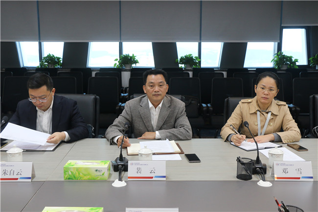 圖為欽州港片區(qū)產(chǎn)業(yè)服務(wù)中心主任裴云(中)到公司調(diào)研并座談。
