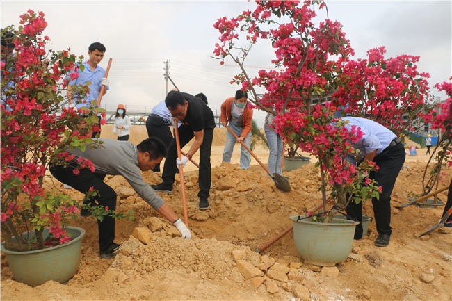 植樹(shù)現(xiàn)場(chǎng),大家擼起袖子、揮動(dòng)鐵鍬、扶正樹(shù)苗、填土夯實(shí)……每個(gè)人都干勁十足,各個(gè)環(huán)節(jié)銜接有序,配合默契,現(xiàn)場(chǎng)一片火熱朝天的景象,大家合力種下一排排樹(shù)苗,現(xiàn)場(chǎng)一片綠意與生機(jī)。本次活動(dòng)累計(jì)種植三角梅、木麻黃樹(shù)苗600余株。