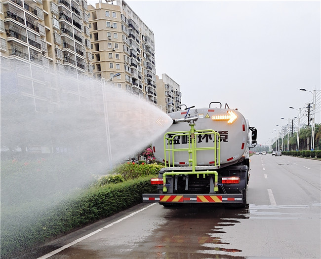 此次新添的灑水車集噴藥、灑水、沖洗等功能,水箱總?cè)莘e達(dá)12.2m3,有效容積10.1m3,噴灑范圍達(dá)38m,可調(diào)成霧狀、柱狀或錐狀等噴灑水流針對不同的植物進(jìn)行澆灌。