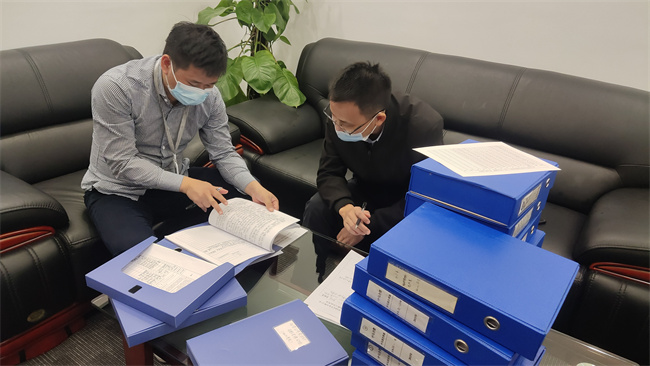 楊明來(右)檢查清廉企業(yè)建設臺賬資料