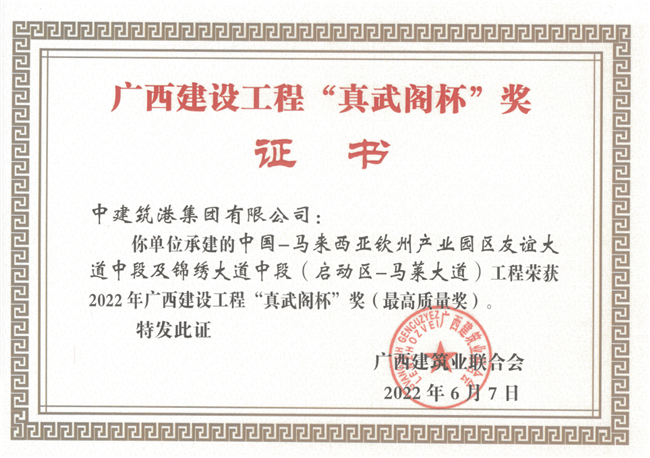 2022年6月7日,合資公司中國(guó)-馬來(lái)西亞欽州產(chǎn)業(yè)園區(qū)友誼大道中段及錦繡大道中段(啟動(dòng)區(qū)-馬萊大道)工程榮獲2022年廣西建設(shè)工程 “真武閣杯”獎(jiǎng)。