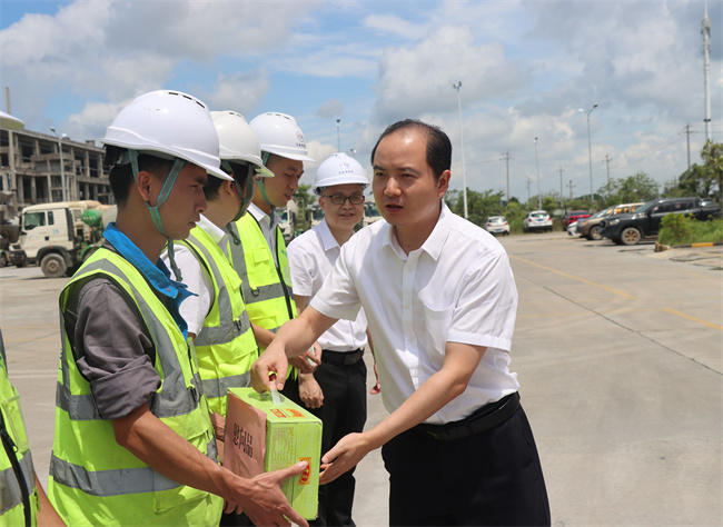 近日,欽州市持續(xù)受高溫天氣影響,烈日炙烤下的戶外及作業(yè)現(xiàn)場熱浪襲人,給堅(jiān)守在一線的職工帶來嚴(yán)峻“烤” 驗(yàn)。2025年7月25日,廣西中馬欽州產(chǎn)業(yè)園區(qū)開發(fā)有限公司(下稱中馬合資公司)總裁陳思進(jìn)、副總裁程繼武、首席財(cái)務(wù)官江俊豪、工會主席余海鵬帶領(lǐng)慰問組,攜帶防暑降溫物資深入基層一線開展“夏日送清涼”慰問活動,向堅(jiān)守崗位的職工送去誠摯的關(guān)懷與清涼慰藉。